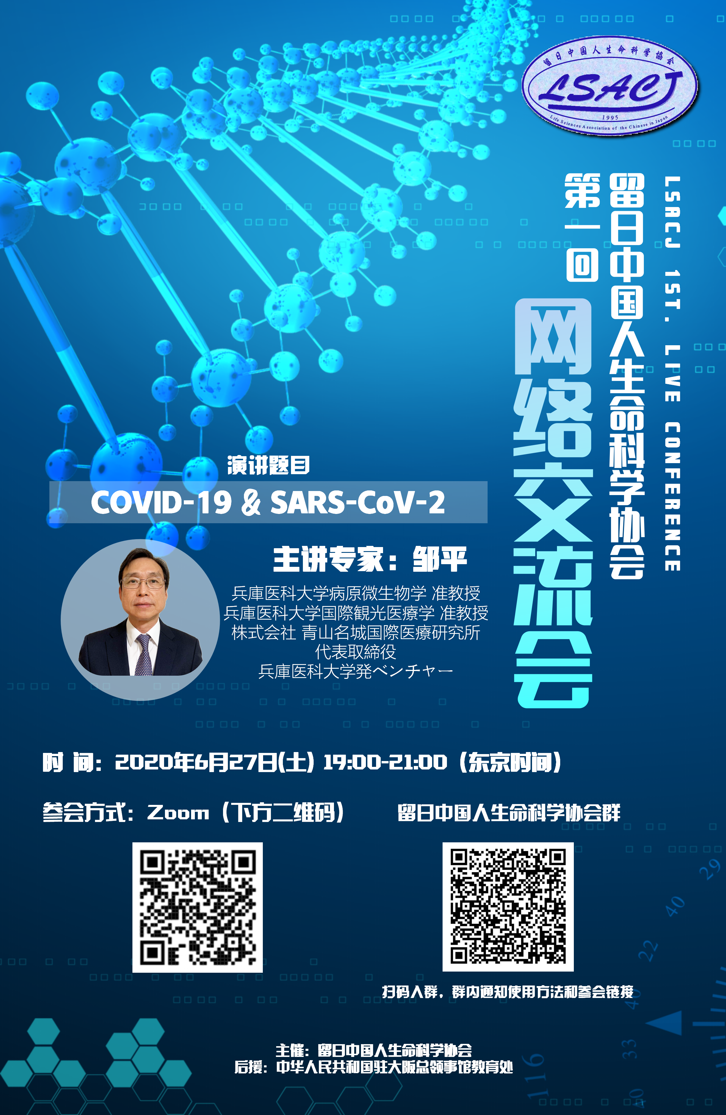 演讲题目:COVID-19とSARS-CoV-2 时 间:2020年6月27日(土) 19:00-21:00(日本时间) 主讲专家:邹平 教授 兵庫医科大学病原微生物学 准教授 兵庫医科大学国際観光医療学 准教授 株式会社 青山名城国際医療研究所 (兵庫医科大学発ベンチャー) 代表取締役 主催:留日中国人生命科学协会 后援:中华人民共和国驻大阪总领事馆教育处 留日中国人生命科学协会 2020年6月24日